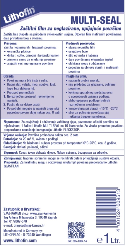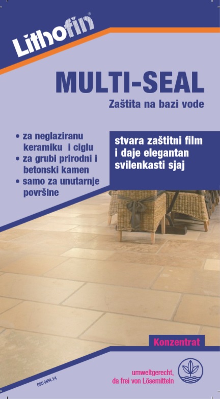 Napraviti probni uzorak. Nije prikladno za glazirane, polirane površine. Slabo upijajuće površine tretirati razrijeđenim sredstvom. Stroj za poliranje povećava sjaj i uklanja tragove nanošenja. Za osvježenje i održavanje zaštitnog sjaja, povremeno površinu očistiti s mješavinom 1 šalica MULTI-SEAL na 10 litara vode. Za visoko prometne površine preporučamo nanošenje Lithofin FLECKSTOP imprgnacije.
